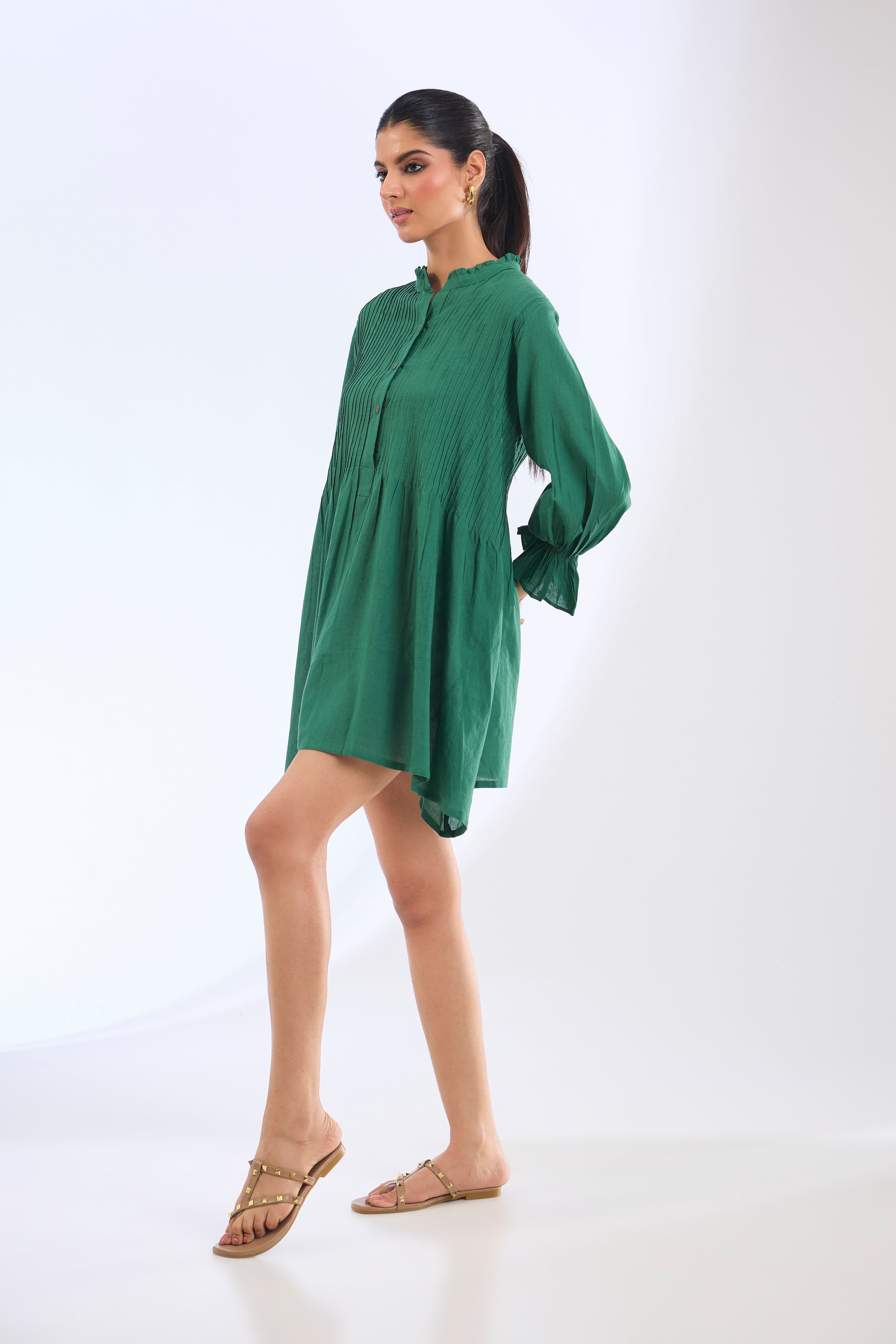 A celebration of refined craftsmanship and effortless comfort, this emerald green dress is crafted from 100% handloom cotton. The thoughtful pintuck detailing on the bodice adds texture and structure, while the flowy silhouette ensures relaxed elegance.